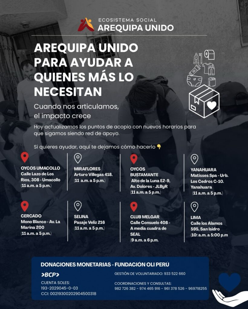 Ante la emergencia por las lluvias y huaicos en la región, la iniciativa Ecosistema social AREQUIPA UNIDO ha consolidado una red de ayuda que articula el esfuerzo de ciudadanos, empresas y colectivos. Este colectivo busca canalizar y organizar todas las iniciativas de apoyo para asegurar que las donaciones lleguen de forma efectiva y afectiva a las familias afectadas.