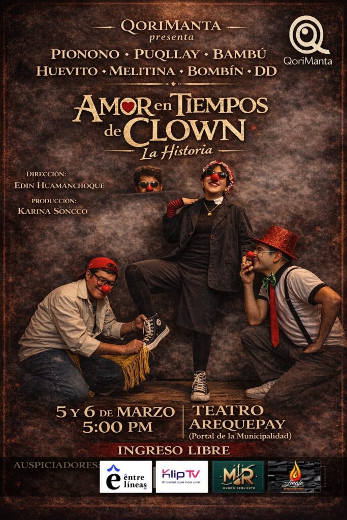 La compañía teatral Qorimanta presenta «Amor en Tiempos de Clown: La Historia», un montaje de creación colectiva que explora el amor desde la ternura, la exageración y la torpeza clown. La obra se estrenará los días 5 y 6 de marzo a las 5:00 p.m. en el Teatro Arequepay (Portal de la Municipalidad), con ingreso libre para todo el público.