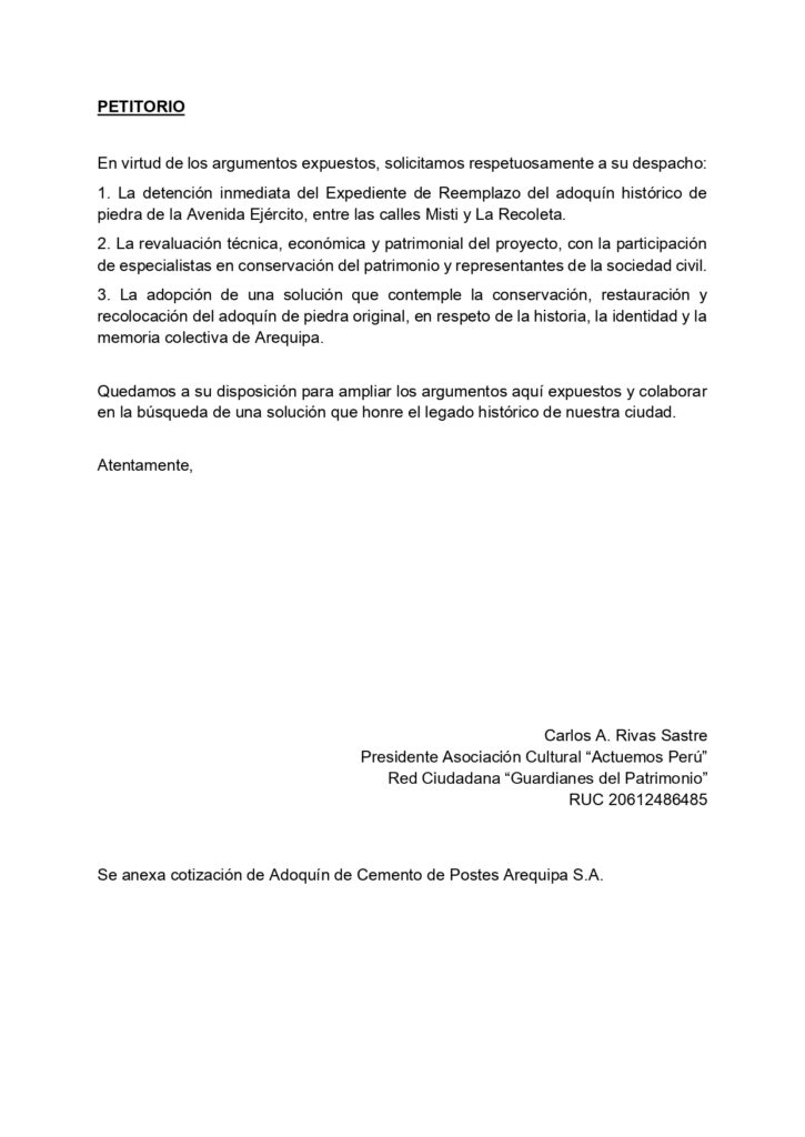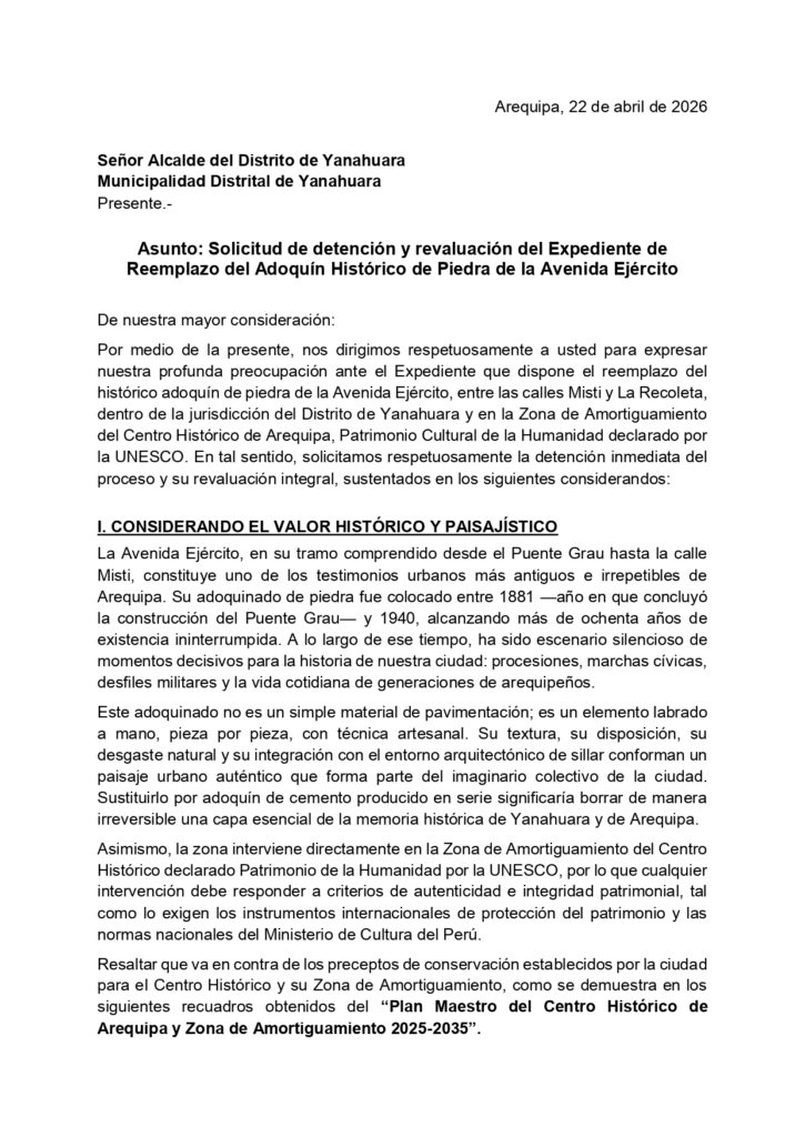 Diversas organizaciones de la sociedad civil, colectivos ciudadanos e instituciones vinculadas a la defensa del patrimonio cultural han solicitado formalmente a la Municipalidad Distrital de Yanahuara la detención inmediata del expediente técnico que aprobó el reemplazo del adoquinado histórico de piedra de la Avenida Ejército, en el tramo comprendido entre las calles Misti y La Recoleta.