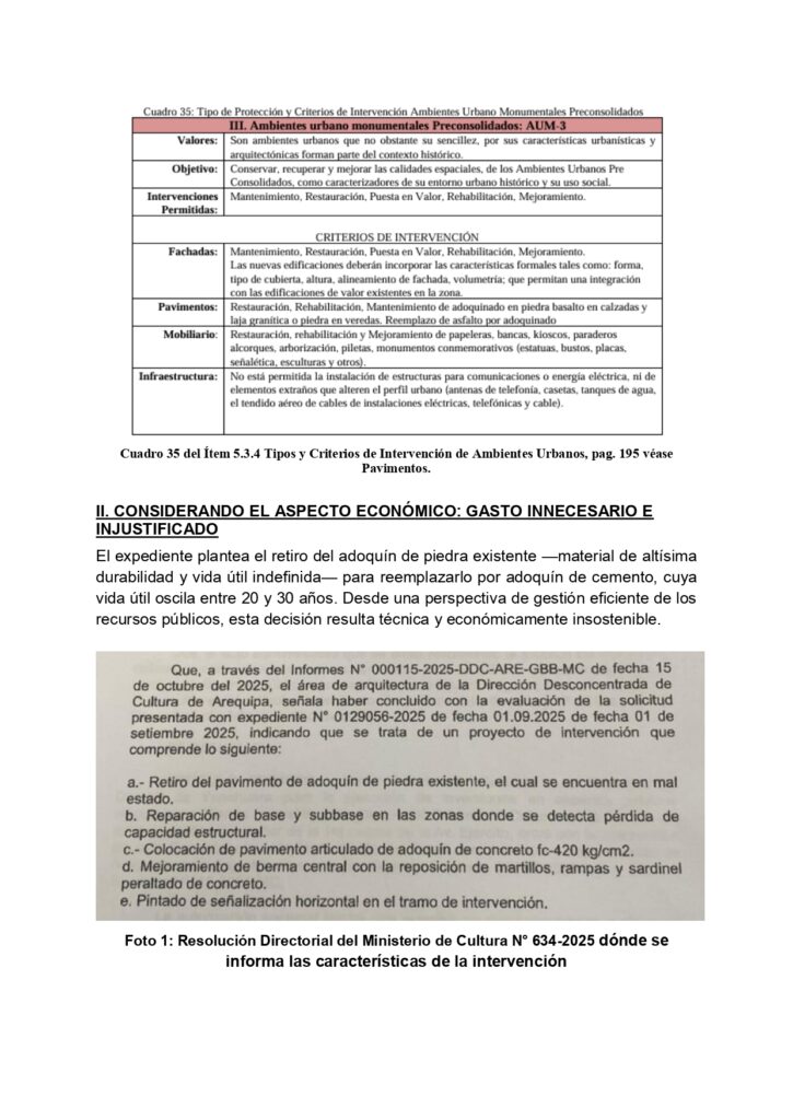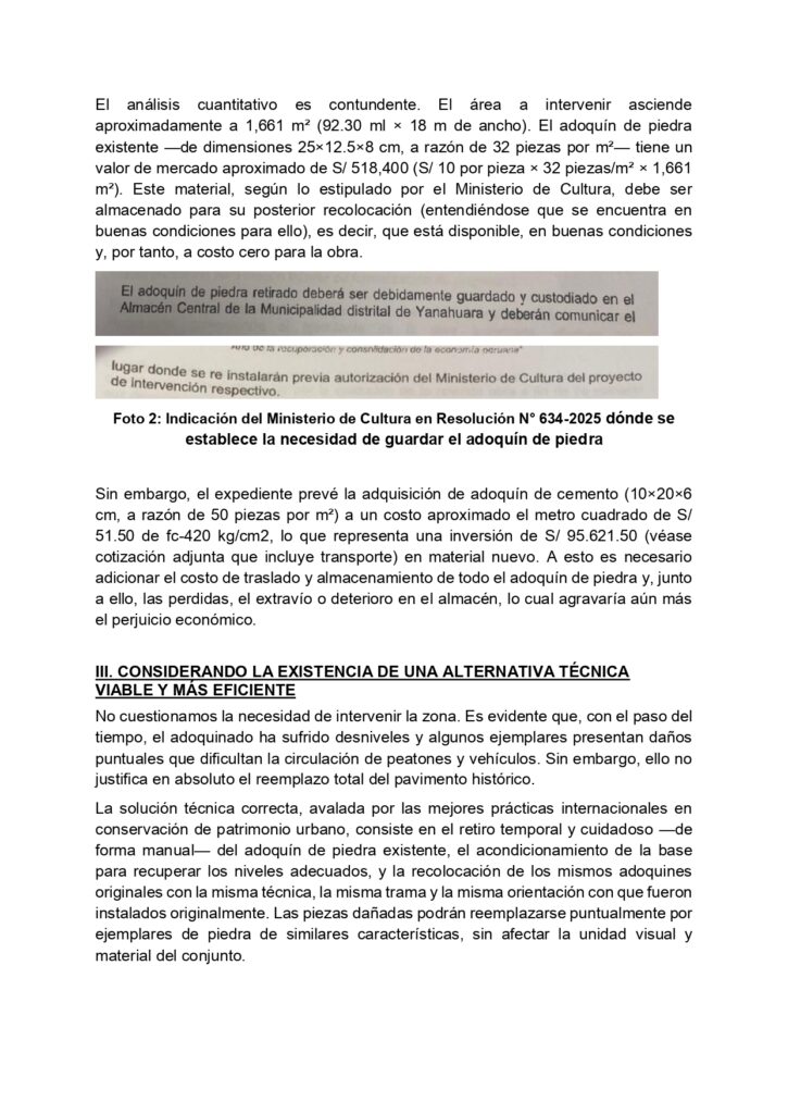 El pronunciamiento también señala inconsistencias en la propuesta desde el punto de vista técnico y económico. Mientras el adoquinado actual presenta una durabilidad prácticamente indefinida y un valor de mercado significativo, el proyecto contempla una inversión cercana a los S/ 95,000 en materiales de menor vida útil, estimada entre 20 y 30 años.